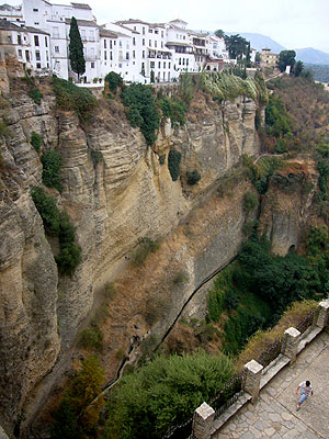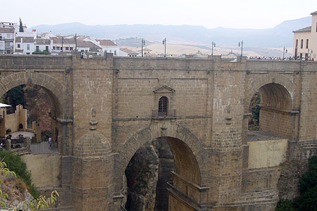 ロンダの町へのアクセスは絶壁の反対側にあたる新市街の北東側からとなるため、町に着く際に特に感慨はありません。新市街を南に突き進み町の中心であるスペイン広場(Plaza de España)に近づくと、ようやく観光地らしい賑わいが現れてきました。さらに広場から旧市街の方向へ進もうとすると、既に目の前には峡谷に架かるヌエボ橋(Puente Nuevo)が待ちかまえていました。ロンダの新市街と旧市街は高さ100mほどの峡谷で隔てられていて、その間には3つの古い橋が架っていますが、18世紀に建設されたヌエボ橋が最も新しいながらその重厚な佇まいは町のシンボルとなっています。
