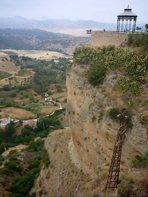 町の西側には絶壁が続き、眼下には原野が遠くの山々まで広がっています。この素晴らしい風景を堪能するために断崖の先端には展望台が設けられていますが、その展望台を遠くから見ると、頼りないキャンチレバーで空中に突き出す様子に見ている方がはらはらします。ヌエボ橋のすぐ脇には断崖に建つ人気のパラドールもあり、そのテラスに散歩がてら立ち寄ってゆっくりと絶景を楽しむこともできます。残念ながら今回はロンダで夜を過ごせませんでしたが、日が暮れるとヌエボ橋や峡谷がライトアップされて、何とも幻想的な夜景が浮かび上がることでしょう。