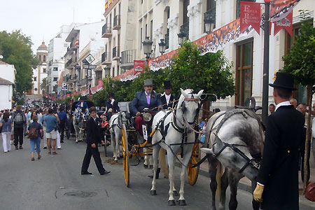 闘牛場の正面の道路にはゼッケンを付けた馬車が遠くまで列をなし、歩道は大勢の人たちで埋め尽くされていました。馬車には黒い帽子を被った馭者と華やかな衣装をまとった年配の紳士と婦人が乗り合わせ、出発の合図を待っているようです。そのうち歓声が起こり、馬車の列はゆっくりと動き出したかと思うと次々に闘牛場の中に入っていきました。闘牛の前の余興なのでしょうか、ゼッケンの様子からすると馬車の優雅さを競うコンテストでもあるのかもしれません。