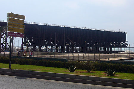 案内所のガイドから港に面白いものがあると聞いて足を運んでみると、何やら存在感のある黒い構造物が視界に入ってきました。やたらと鉄骨の脚が設けられた高架橋は海に突き出したまま行き止まりとなっていますが、この上には線路が引かれています。以前は採掘所から鉄道で鉱石を運び出しこの波止場で輸送船に積み入れていたのでしょうが、今はもう近代の産業遺構と化してしまったようです。それにしてもこの海辺の舞台の積載荷重はとてつもなく大きそうです。