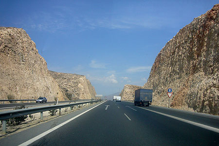 翌朝ネルハを出発して一路アルメリアを目指します。マラガから東に延びる高速道路はこの先建設中のため険しい海岸線沿いの一般道を走り抜けなくてはなりません。道中草木の全くない荒涼とした岩山の岸壁が延々と続き、時折鉱石採掘場らしき風景が姿を現します。ようやく岩山が終わったかと思うと、今度は平野一面に白いビニルハウスの海が目に飛び込んできました。一見して何が広がっているのかわからずあまりに無機質な光景に圧倒されましたが、どうやらこの地方はハウス野菜の一大産地、「ヨーロッパの農園」と呼ばれているそうです。