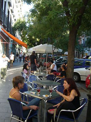 多少の用心をしながら、歩を緩めずに地下鉄駅のあるラバピエス広場(Plaza de Lavapiés)を目指します。途中、小さなバルを数軒通り過ぎましたが、飾り気のなさはいかにも下町風。昼下がりにカウンターの隅に置かれたテレビでのんびりと闘牛が放映されている様子は、序の口あたりの大相撲中継が流れる日本の居酒屋とどことなく似ています。広場近くまで来ると、歩道にはオープンカフェが並び、危険地区といわれるこの界隈も穏やかな表情を見せていました。