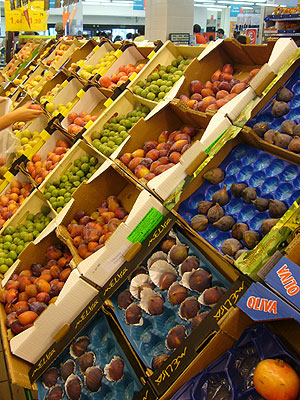 折角足を運んだので、この広場周辺で少しだけ時間つぶしといきましょう。まずは地元住人に混じって街角のスーパーマーケットに入り、店内をぶらつくことにしました。肉、魚、野菜コーナーを素見した後、果物コーナーの充実ぶりに目がとまり、思わずイチジクやアンズ、スモモの類いを一個ずつ量り売りで買ってみました。表に出ると道端にベンチを見つけたので、早速腰を下ろして果物の味見へ。人々が行き交う広場を眺めながら、特有の甘味、酸味が次々と口に広がるのを楽しみました。