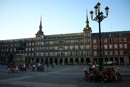ラバピエス地区を後にして、賑やかな中心市街へ繰り出します。北上してアトーチャ通り(Calle de Atocha)に入りそのまま直進すると、アーチをくぐって風格のあるマヨール広場(Plaza Mayor)に突入しました。中央にはフェリペ3世の騎馬像、四方の建物からはオープンカフェが張り出し、夕暮れが近づく中、所々にたむろする若者たちの歓声が響き渡たっています。反対側のアーチから広場の外に出ると、そこはバルやメソンの建ち並ぶ下町の飲屋街、独特の雰囲気を醸し出しています。