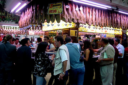 ところでスペインのバルでは、ハモンが天井からずらりとぶら下がっている光景をよく目にします。ハモンの下にはククルチョス(cucurucho)と呼ばれる逆円錐形の容器がついていて、頭上からの脂の落下を防いでいます。まずは他の客を押し分けてカウンターまで辿り着き、自分のスペースを確保しなくてはなりません。次にカウンター内の店員に最大限の自己主張をすると、ようやくワインとタパスにありつけます。最高の一皿はやはりハモン・イベリコ・デ・ベジョータ、どんぐり(bellota)だけで育ったイベリコ豚の生ハムです。皿一面に盛られて出てくる様は圧巻です。