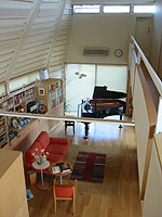 一般に、防音を優先して、音に関して空間を閉じる場合、分厚い壁や小さな窓を用いることになって、視覚的にも閉鎖的な空間となってしまいがちである。ところが、この家の場合、南面全面がガラス窓なので、室内から外部に対して視覚的に開かれていて、陽射しもたっぷり入ってくる。さらには、天井の高い広々とした空間と淡色の内装もあって、家全体が開放的な雰囲気に満ちている。 ピアノの位置からは、玄関もダイニングテーブルもキッチンも、さらに可動式の間仕切りを開ければ奥の和室から2階の寝室まで、ほとんど家全体に視線が届く。奥様によると、ピアノに向かっていても来客がわかるし、生徒がレッスンを待つにも都合がよく、ピアノと家事の両立に便利だそうである。 これだけの広さがあれば、アンサンブルの練習、生徒の発表会やミニコンサートにも十分利用できる。収納性のよい椅子もしっかり用意してあり、標準客席数は40名、これまでの収容最大記録は63名だそうである。奥の座敷では、ご年輩の方や小さなお子さん連れの方でも、気軽に演奏会の雰囲気を楽しむことができそうだし、2階の通路からはステージ脇のバルコニー席さながら、いいアングルで演奏が見物できるに違いない。佐藤さんの空間の開かれた家は、友人や教え子、私も含めて多くの人達にも開かれ、愛着と夢を与えてくれる。
