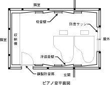 部屋の形としては、全体的には直方体ではあるが、向かい合う壁面が平行にならないように折れ曲がった面で構成したり、天井面に凸面や傾斜をつけて、耳障りなエコーが生じないようにしている。天井高はできるだけ大きく取ることが好ましいため、ピアノ室の床は家の1階部分の床から階段3段分低くなっている。また、味埜さんの響きの好みを反映して、壁面を一部分にしか吸音仕上げとせず、通常のレッスンスタジオに比べてやや長めの響きを目指したようである。ただし、響きが長くなりやすい低音域を吸音するため、天井と壁の交わる上方部分に吸音スペースを設けて、最終的には全ての音域で同程度の響き(残響時間0.4秒程度)を確保している。 遮音については、屋外と他の室内に漏れる両方の音に対して、徹底的な対策が取られている。ピアノ室自体が家のどの部分とも完全に独立していて、音や振動がピアノ室から家本体には伝わらない構造となっている。家の中に箱を作って、その中にピアノ室というもう一つの箱をいれたような形をしているのである(ボックスインボックス構造)。ピアノ室は家のコンクリート基礎の上に直接防振ゴムをひいたその上に置かれており、ピアノ室と家の壁は接することなく、また天井も防振ハンガーで吊されている。さらに、隙間が問題となりやすい窓やドアについても、三重サッシと鋼製防音扉により万全を期していて、窓のすぐ外やピアノ室前の廊下でも微かにしか音が聞こえない。 まだまだある検討事項