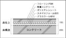 (1)床衝撃音 上階の床に衝撃的な力が加わった結果、下階で発生する音を「床衝撃音」という。その中でも、子供の跳びはねや走り回りなど、重くて柔らかい衝撃によるドスドスという音を「重量床衝撃音」、ハイヒールの歩行や食器の落下など、軽くて硬い衝撃によるコツコツという硬い音を「軽量床衝撃音」といい、二つを区別する。両者は発生の機構が大きく異なるため、防音対策も別の方法が必要となる。 (2)床構造と床仕上げの影響 床構造とは、建物が立っているための構造の一部分であり、頑丈な構造ほど、重量床衝撃音は小さく抑えられる。構造の種類としては、木造、鉄骨造、鉄筋コンクリート造などがあるが、一般に鉄筋コンクリート造が最も頑丈であり、床の厚さが増すにつれて、重量床衝撃音は小さくなる。一方、床仕上げとは、床構造の上に設けられたフローリング、タイルやカーペットなどの仕上げ材を指し、軽量床衝撃音とは密接な関係がある。コンクリート素面のように表面が堅い場合、床構造がしっかりしていても、軽量床衝撃音は発生しやすいのに対して、カーペットのように表面が柔らかい場合は、顕著に抑えられる。その他、近年は床構造の上に支持脚を並べて、その上にフローリングなどの床材をのせるような二重床がよく用いられるが、床衝撃音の遮断効果は材料の組み合わせによるので、注意が必要である。 | |||||||||||
